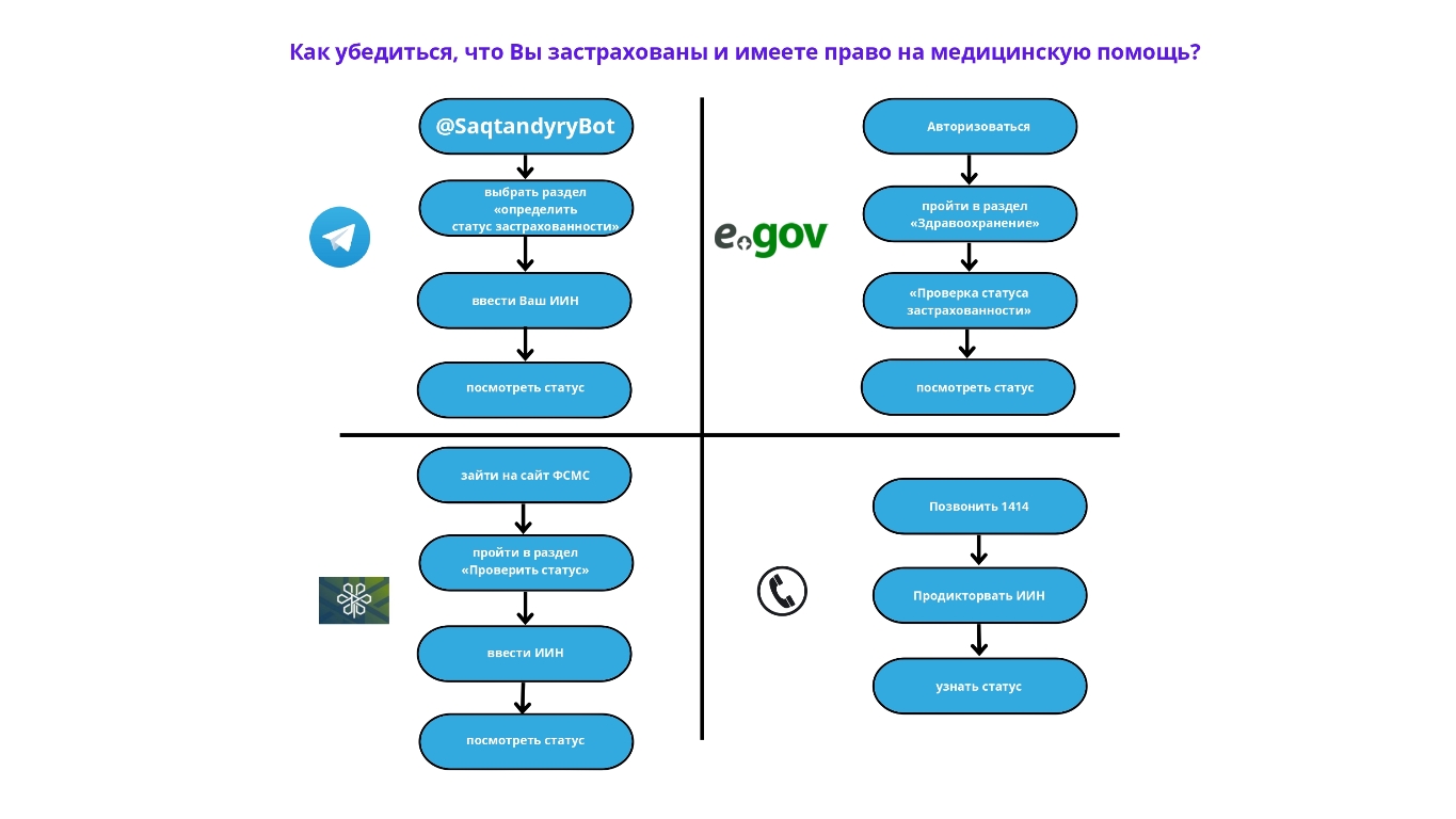 Найти бота: @SaqtandyryBot (бот ФCМС), выбрать раздел «определить статус застрахованности», ввести Ваш ИИН и посмотреть статус: застрахован/не застрахован.